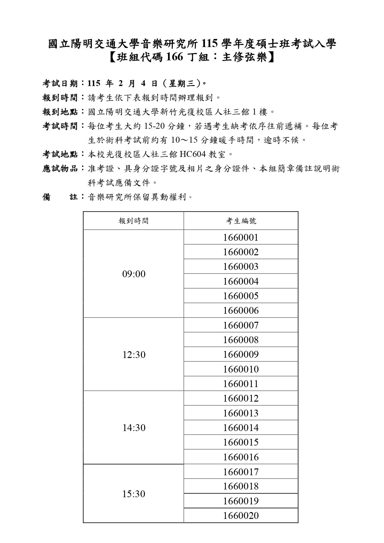 115學年度音樂所碩士班考試入學 166丁組(演奏:弦樂)術科考試公告