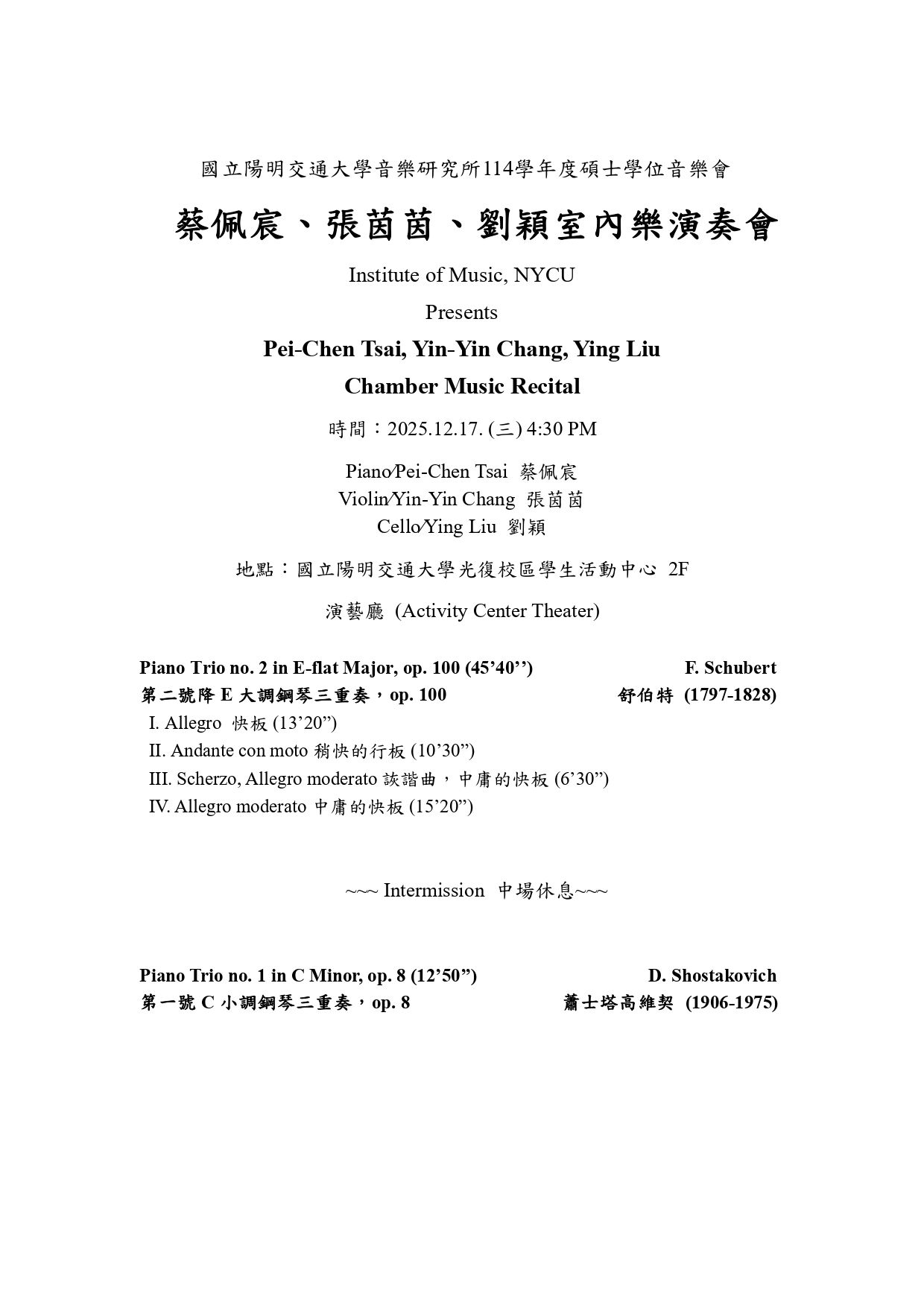 Pei-Chen Tsai, Yin-Yin Chang, and Ying Liu Degree Requirement Chamber Music Concert