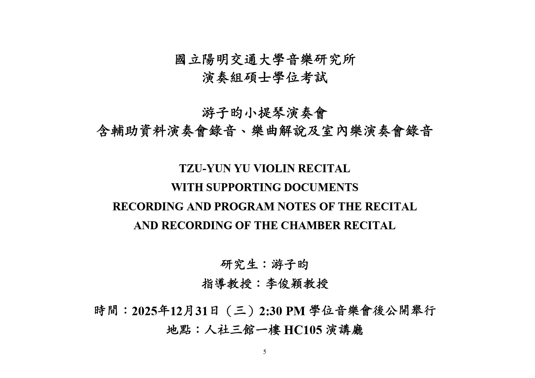 TZU-YUN YU VIOLIN RECITAL WITH SUPPORTING DOCUMENTS RECORDING AND PROGRAM NOTES OF THE RECITAL AND RECORDING OF THE CHAMBER RECITAL