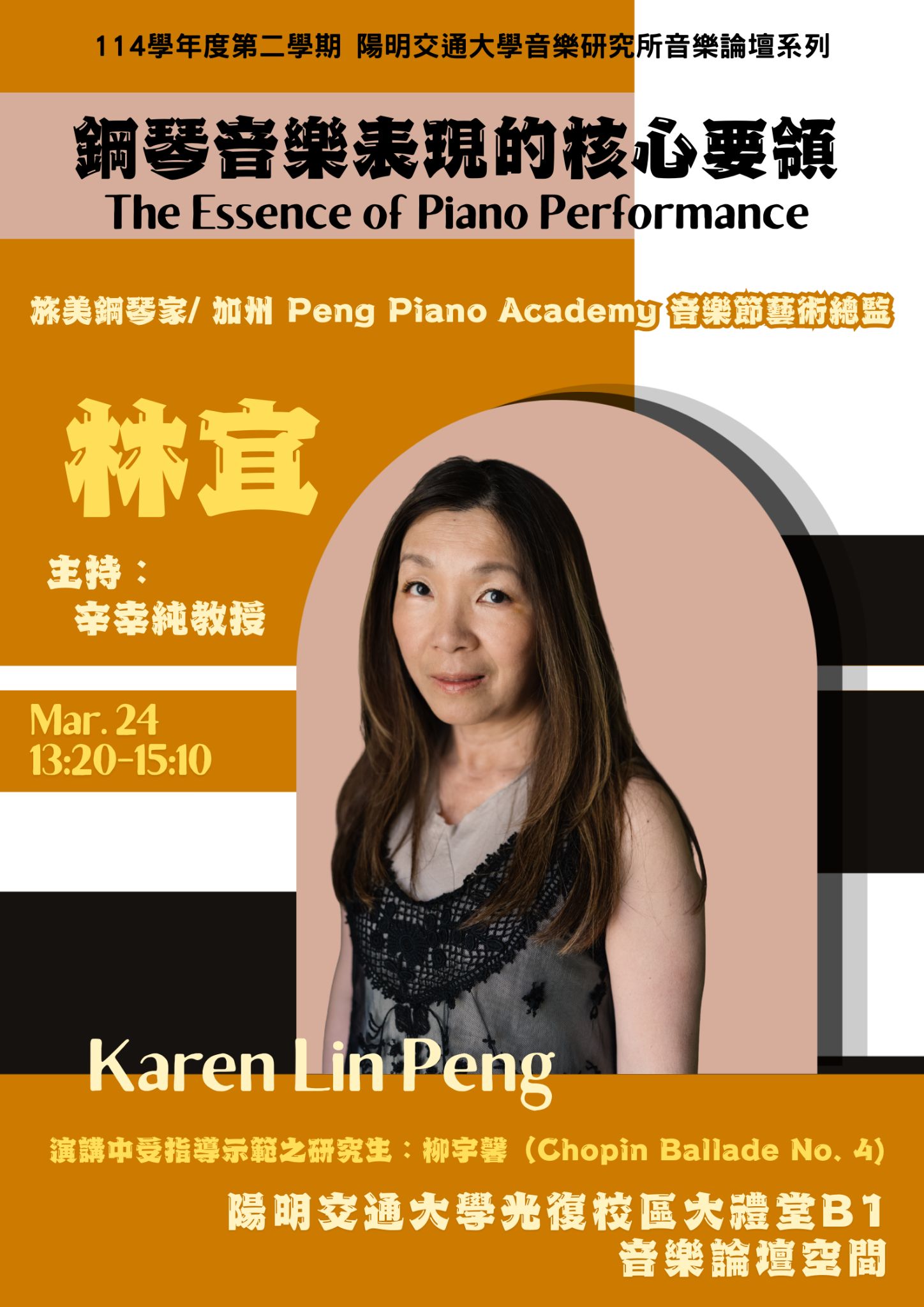 Taiwan born pianist Karen Lin Peng studied at The Boston Conservatory under tutelage of Jung-Ja Kim. She then received a Master of Music degree in piano performance from the Mannes College of Music under professor Arkady Aronov. After returning to Boston, Peng became a pupil of legendary pianist Anthony di Bonaventura. In the summer, she went to Sion Music Festival studying under professor Peter Feuchtwanger, and participated in the Salzburg Mozarteum, Denmark, and the Alfred Cortot Festival in France.